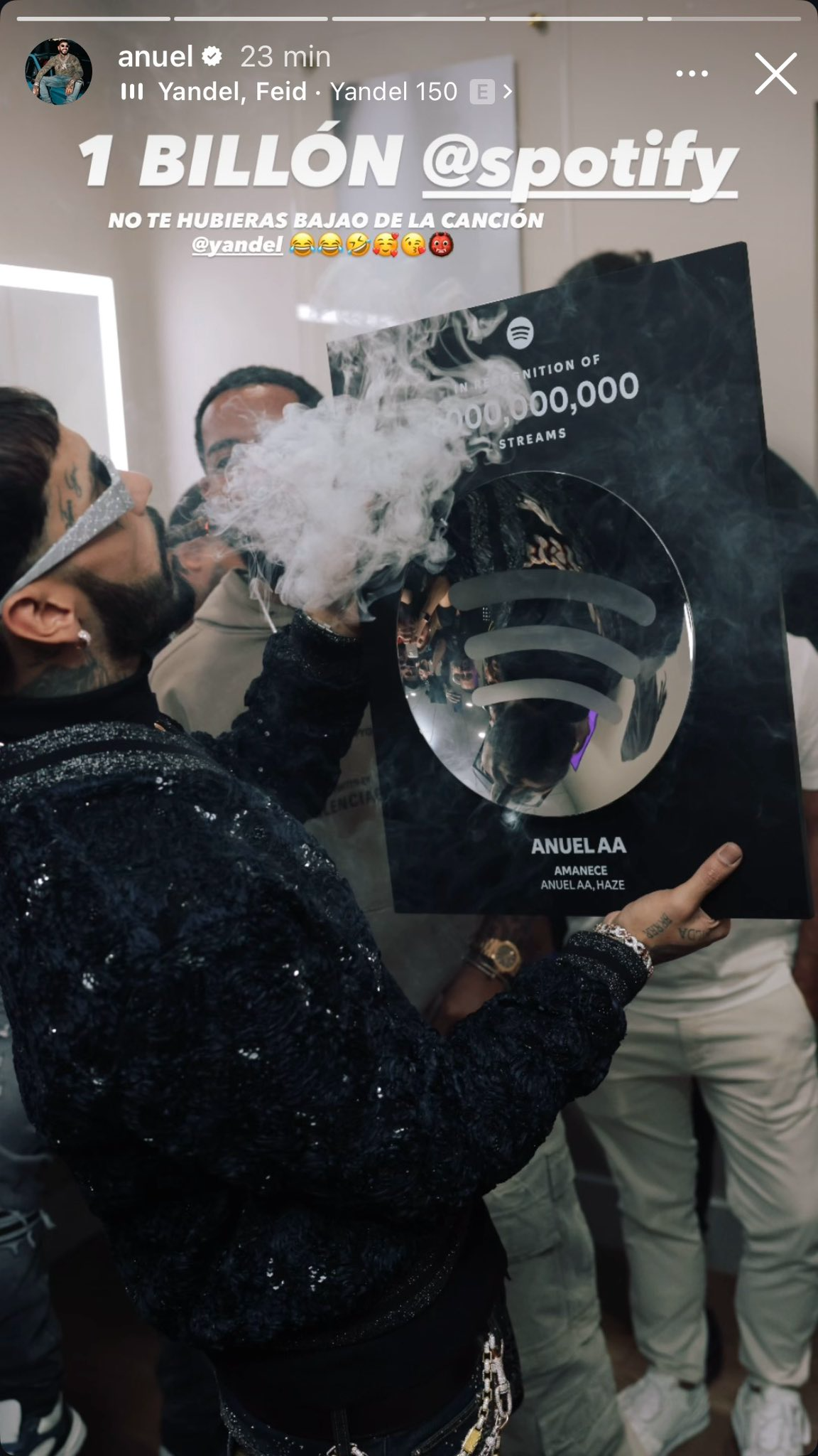 La historia de Instagram muestra a Anuel mirando fijamente la placa de certificación, mientras exhala humo de tabaco sobre ella. El cantante acompañó esta foto con el siguiente mensaje: “No te hubieras bajao de la canción, Yandel”.