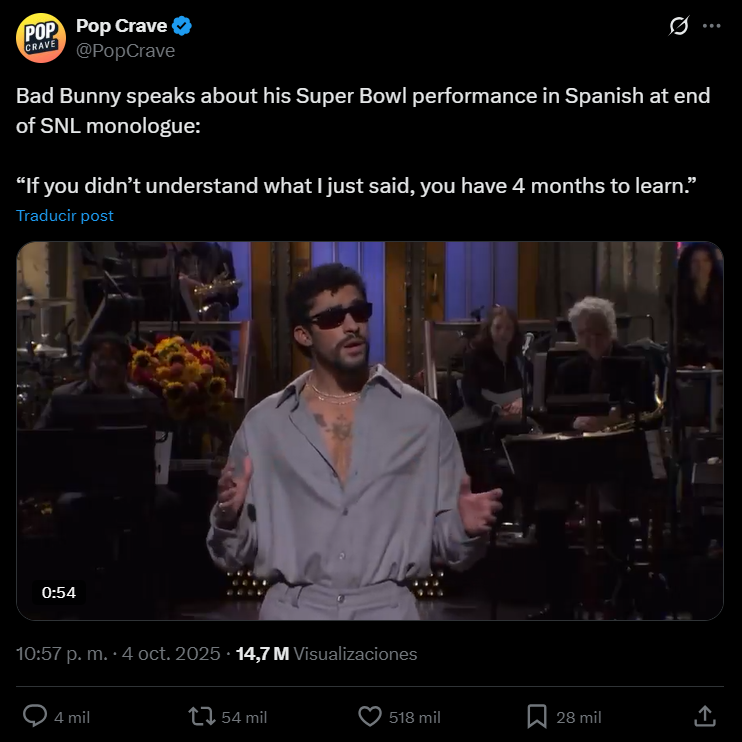Dejando claro ante sus fans en todo el mundo que en esta oportunidad el show del medio tiempo de Bad Bunny será únicamente en español, enviando un mensaje claro al gobierno de Donald Trump.