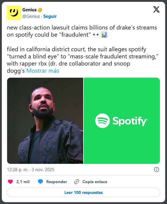 En la demanda se alega que de los 37 mil millones de reproducciones de Drake, “un porcentaje sustancial y nada insignificante [son] inauténticos y parecen ser obra de una extensa red de cuentas bot”.