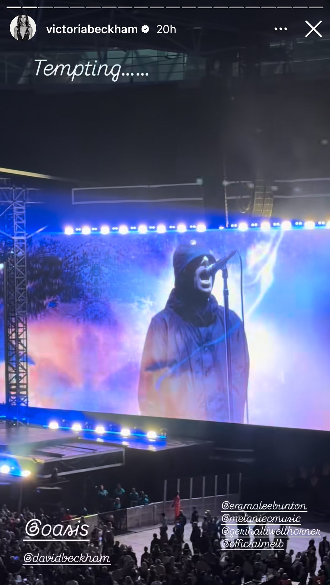 La misma asistió al concierto con su esposo, el ex ídolo del fútbol David Beckham, así como con sus hijos. Allí, generó revuelo entre los fans al publicar una foto de Oasis en el escenario e insinuar una posible reunión de las Spice Girls.