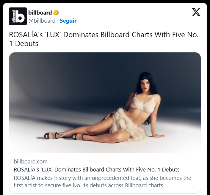 Rosalía hace historia al convertirse en la primera artista en lograr cinco debuts en el No. 1 de las listas de Billboard, con su nuevo álbum ‘LUX’.