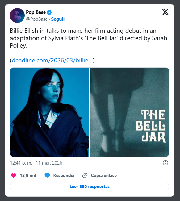 Billie Eilish podría hacer su debut como actriz en la pantalla grande en una adaptación de la novela clásica de Sylvia Plath, The Bell Jar, dirigida por Sarah Polley de Women Talking.
